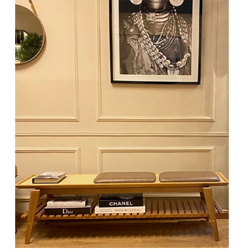 Banco com estrutura em madeira, assento em palha natural e almofadas estofadas.