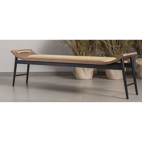 O banco Sillá possui a estrutura em madeira, assento em tecido e metal nos botões que se contrastam em equilíbrio. Essa peça traz linhas curvas que remetem ao movimento das asas dos pássaros ao alçar voo, com elementos que dão contraste ao mobiliário. Esta é uma peça exclusiva assinada pelo designer Fabrício Roncca.