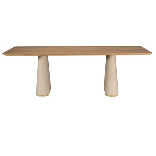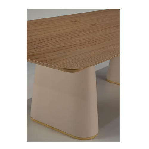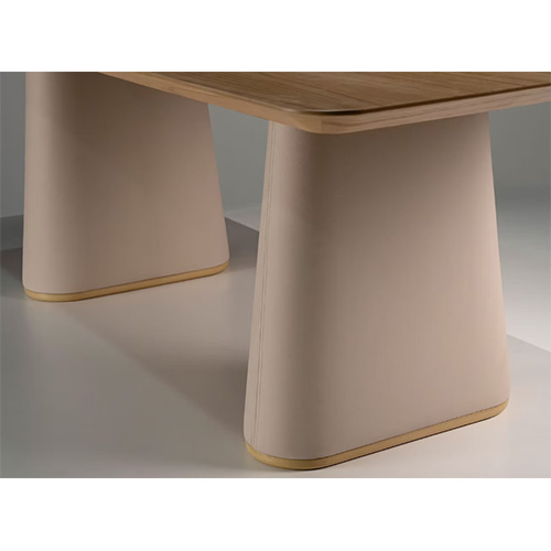 Selma-Msul é uma proposta diferenciada para o portfólio de mesas Msul, já que a mesa apresenta a base com desenho abaulado e revestida totalmente em couro sintético e o tampo em madeira com bordas arredondas.