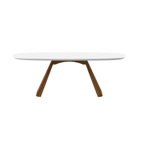 As formas geométricas foram fontes de inspiração para essa mesa de jantar de aspecto leve. No traço, o encontro de linhas retas e cantos suavemente boleados, geram os pés triangulares, que afastados entre si, enfatizam o detalhe vazado ao centro, gerando o equilíbrio perfeito entre a base e o tampo