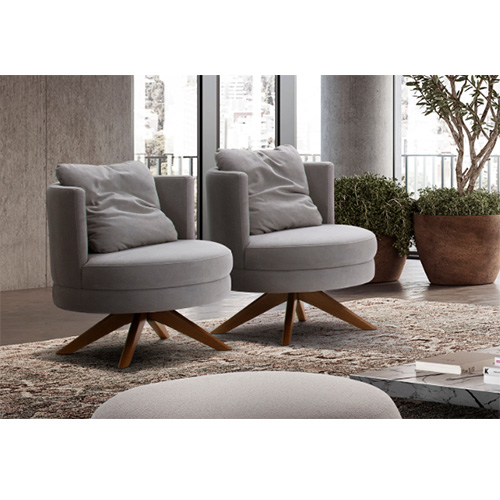 Poltrona Angle-Serra Gaúcha Estofados, com base giratória em aço carbono ou madeira.