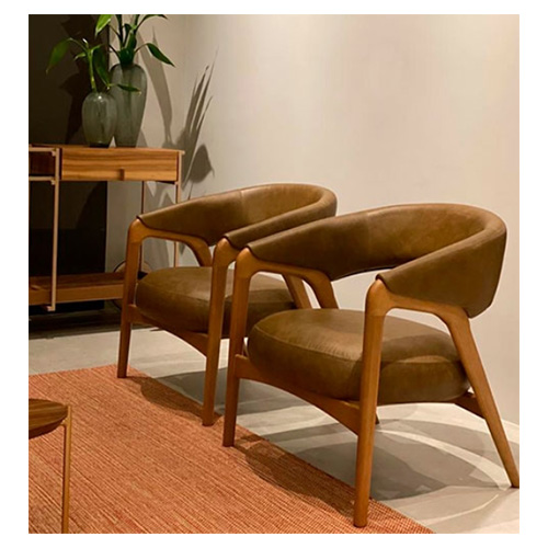 Poltrona Arc-Tumar com estrutura interna do encosto hibrida estofada, assento em multilaminado estofado, base fixa em madeira tingid